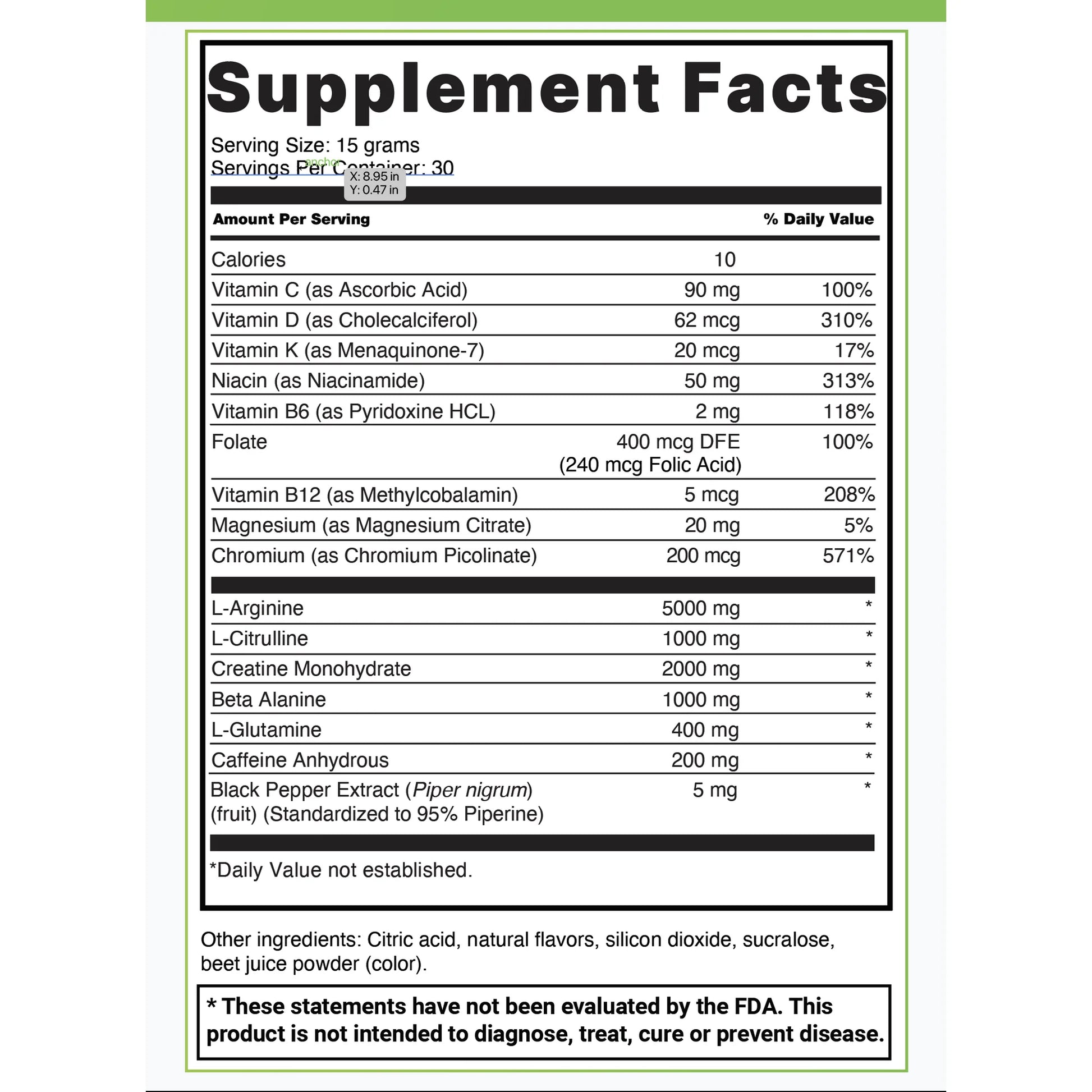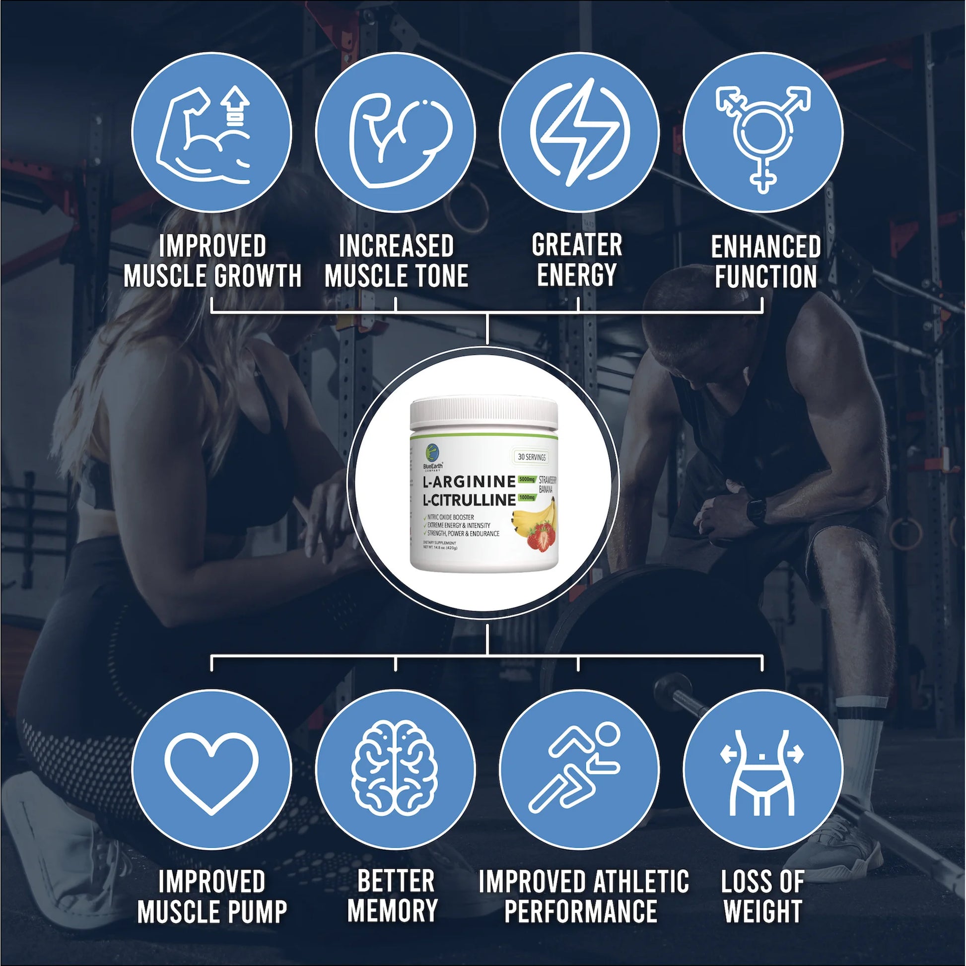 • L-Arginine 5000mg + L-Citrulline 1000mg amino acid ratio to naturally improve blood flow to the body and extremities by releasing Nitric Oxide (NO).